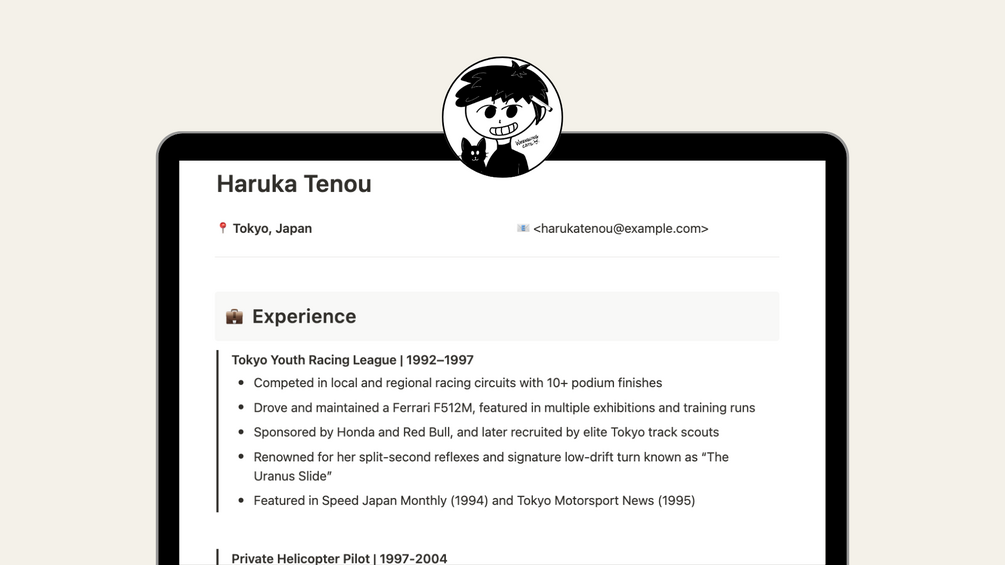 Skip the random, boring, blank resume templates and start with a playful, fully filled-out example based on Haruka Tenou's fictional career path: F1 driver, piano virtuoso, Sailor Senshi extraordinaire! (Happy Pride btw 🌈)